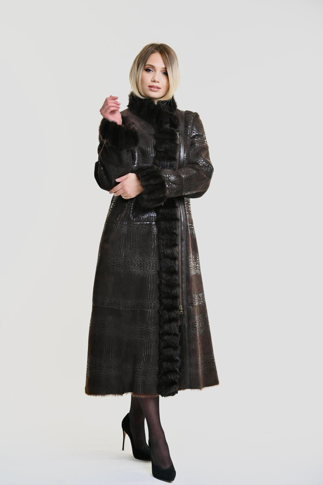 Дублянка жіноча натуральна довга ексклюзивна коричнева прикрашена хутром норки