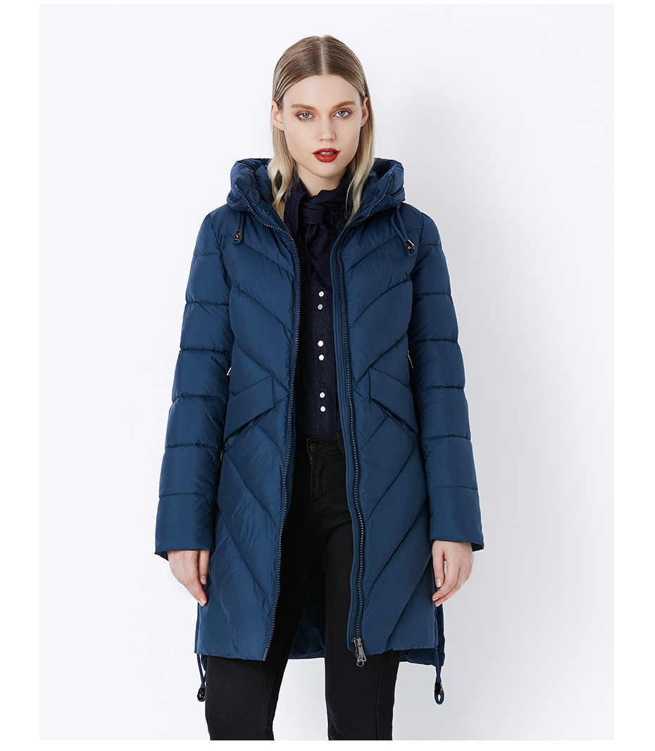 Брендове виготовлення гарантує бездоганну якість і відповідність сучасним модним тенденціям. Тепле пухове пальто з капюшоном у синьому кольорі морської хвилі, внутрішня частина капюшона та підкладка виготовлена в однакової забарвленню. Пальто прямого крою, злегка звужено до низу. Застібка на блискавці з двома бігунками, стрункить фігуру та додає оригінальності виробу. На виробі є п'ять кишень — дві на блискавці, дві прорізні й одна внутрішня кишеня. Рукави повної довжини. Знизу на зап'ястку трикотажна гумка.